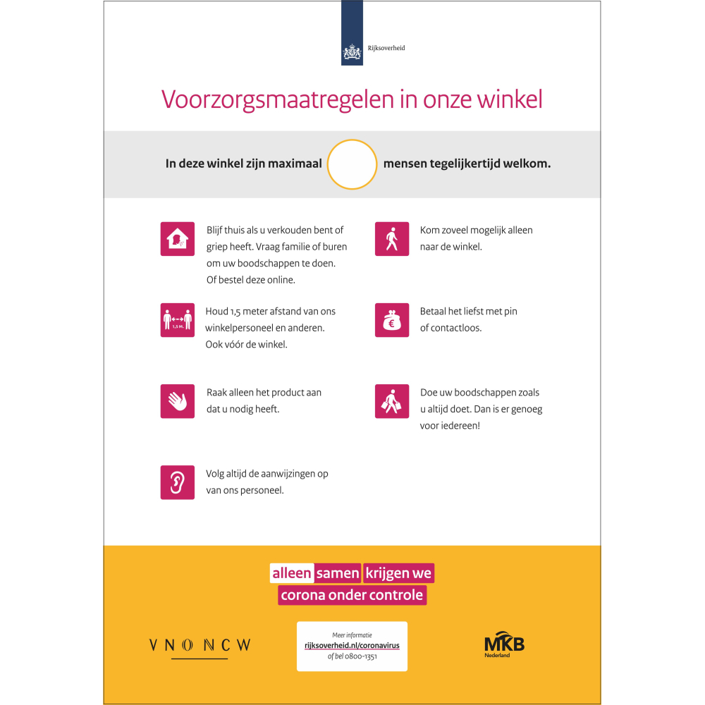 DE POSTER VOORZORGSMAATREGELEN MET MOGELIJKHEID TOT AANGEVEN MAXIMAAL AANTAL BEZOEKERS PRINTEN WIJ GRAAG VOOR U OP A4 OF A3 FORMAAT
